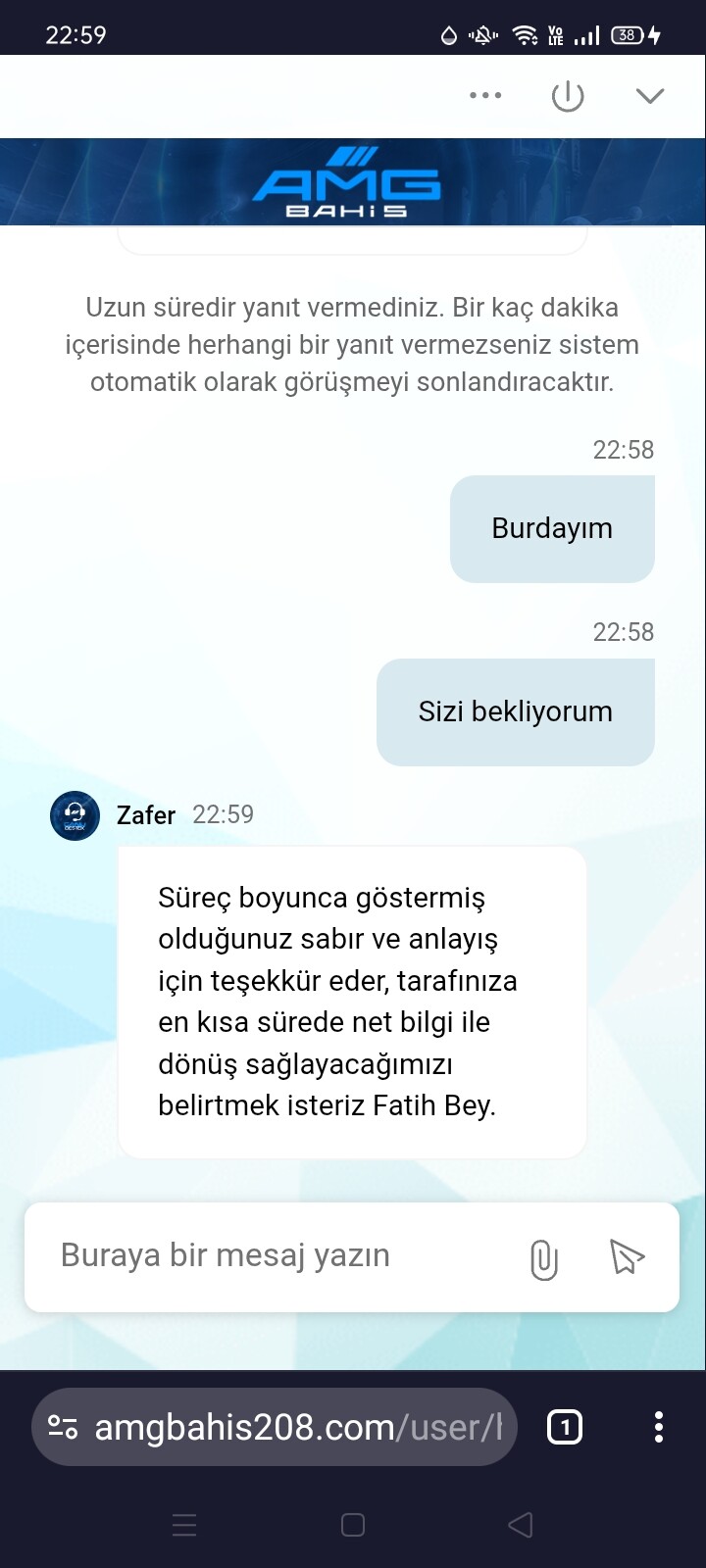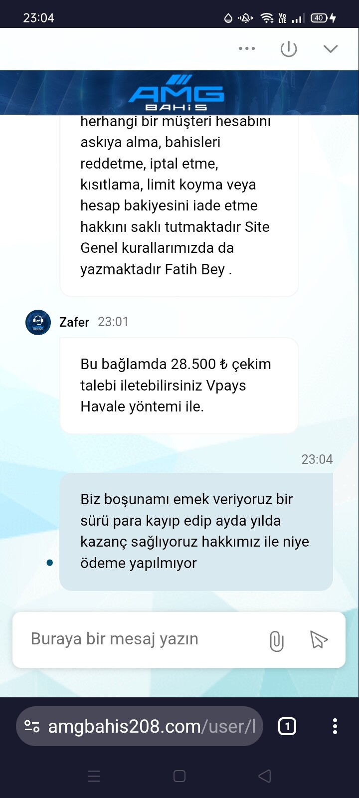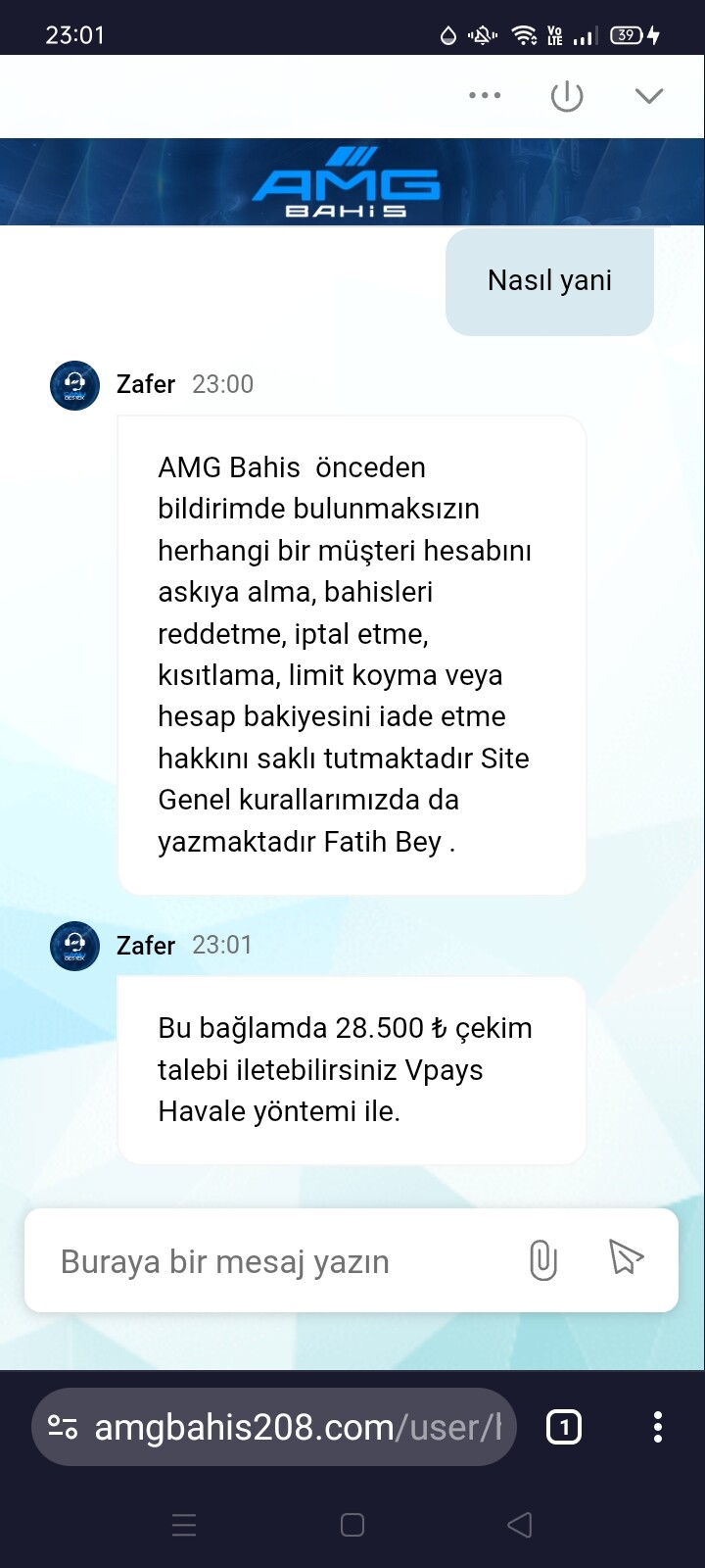 AMG bahis benim de kazancımı ödemedi sponsorlar falan filan ana paramı zorla ödediler tek maç 28.000 basıp 59 bin TL kazandım önce oyaladılar biraz sonra 28.000 çekebilirsiniz dediler, açıklama olarak da istedikleri hesabı kapatıp istediklerin bakiyesini silebilirlermiş hiçbir açıklama yapmak zorunda da değillermiş tüm kanıtları buraya yüklüyorum kesinlikle güvenmeyin tam bir dolandırıcı