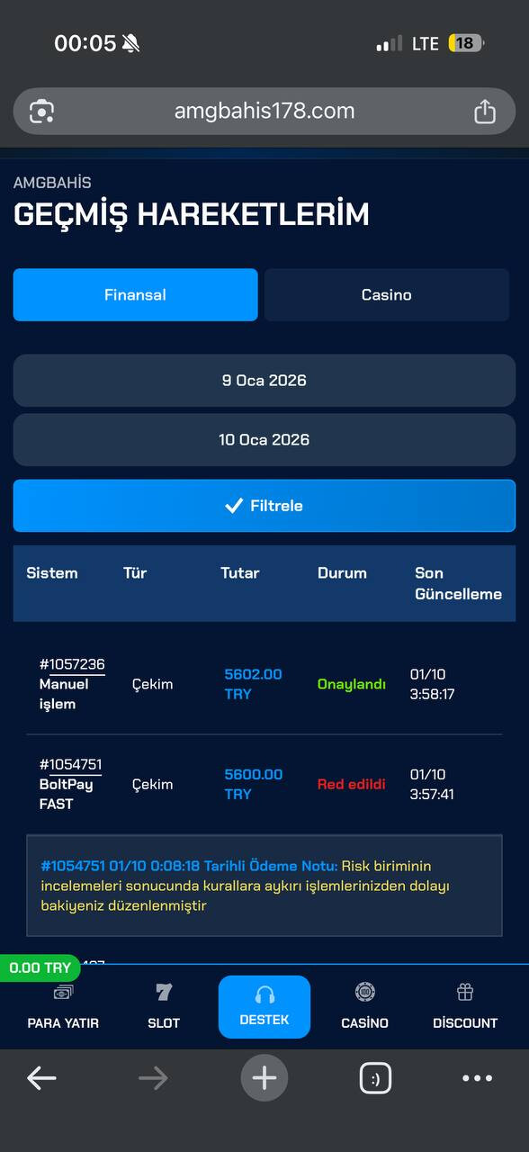 Amgbahis 9 ocakta haksız yere 5600Tl bakiyemi sıfırladı sadece Egt amusnet saglayıcısında kumar oynadım sonrasında çekim verdim iptal edip sıfırladılar bakiyemi 5000 yatırdım en az 10k çevrim yaptım Yuzde yuz kayıp bonusu almıştım baya çevirdim 5-6k odeme yaptı sonra param eridi bende cekiyim kar kardır dedim Sonra bonus suistimali dedi ama ben dsha kayıp yasamadan cekim talep ettim Sonrasında site risk birimi diyip sildi