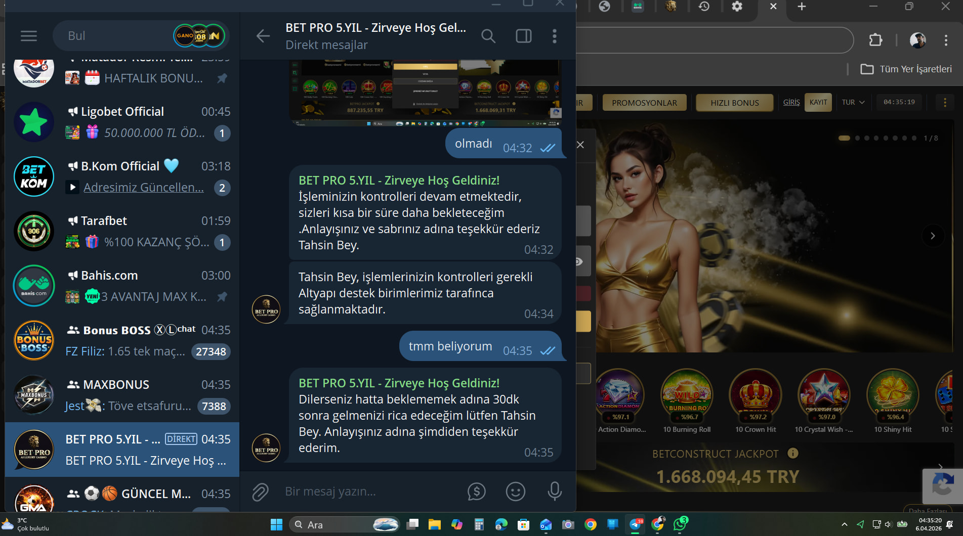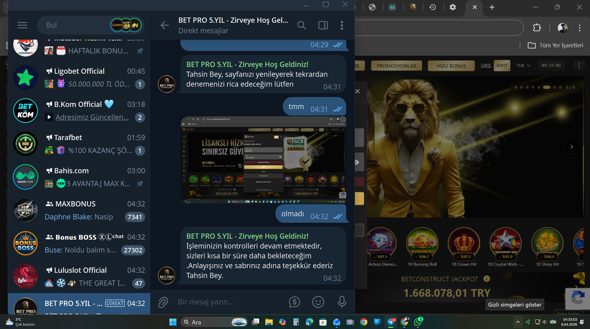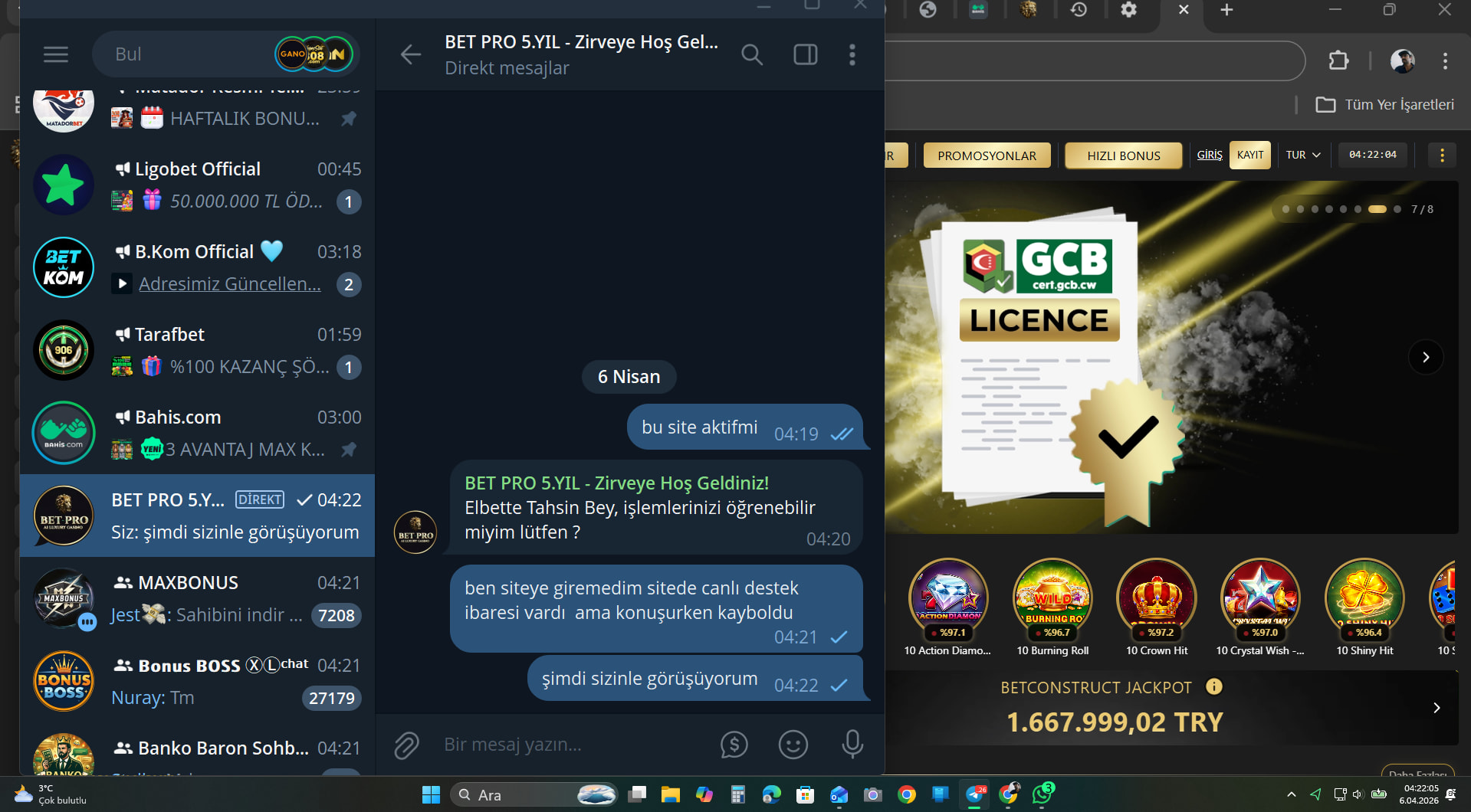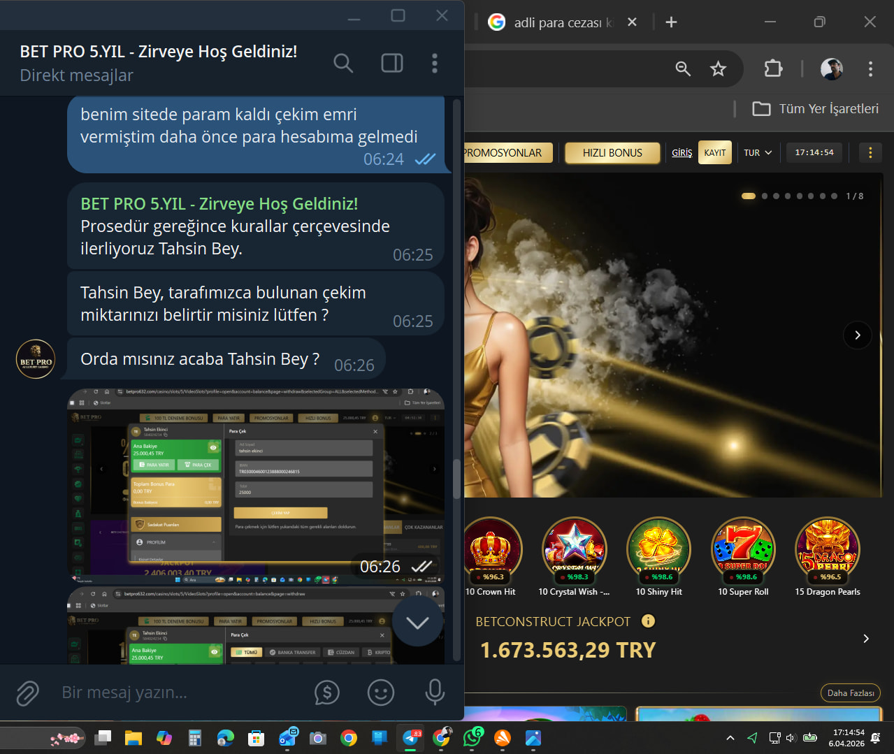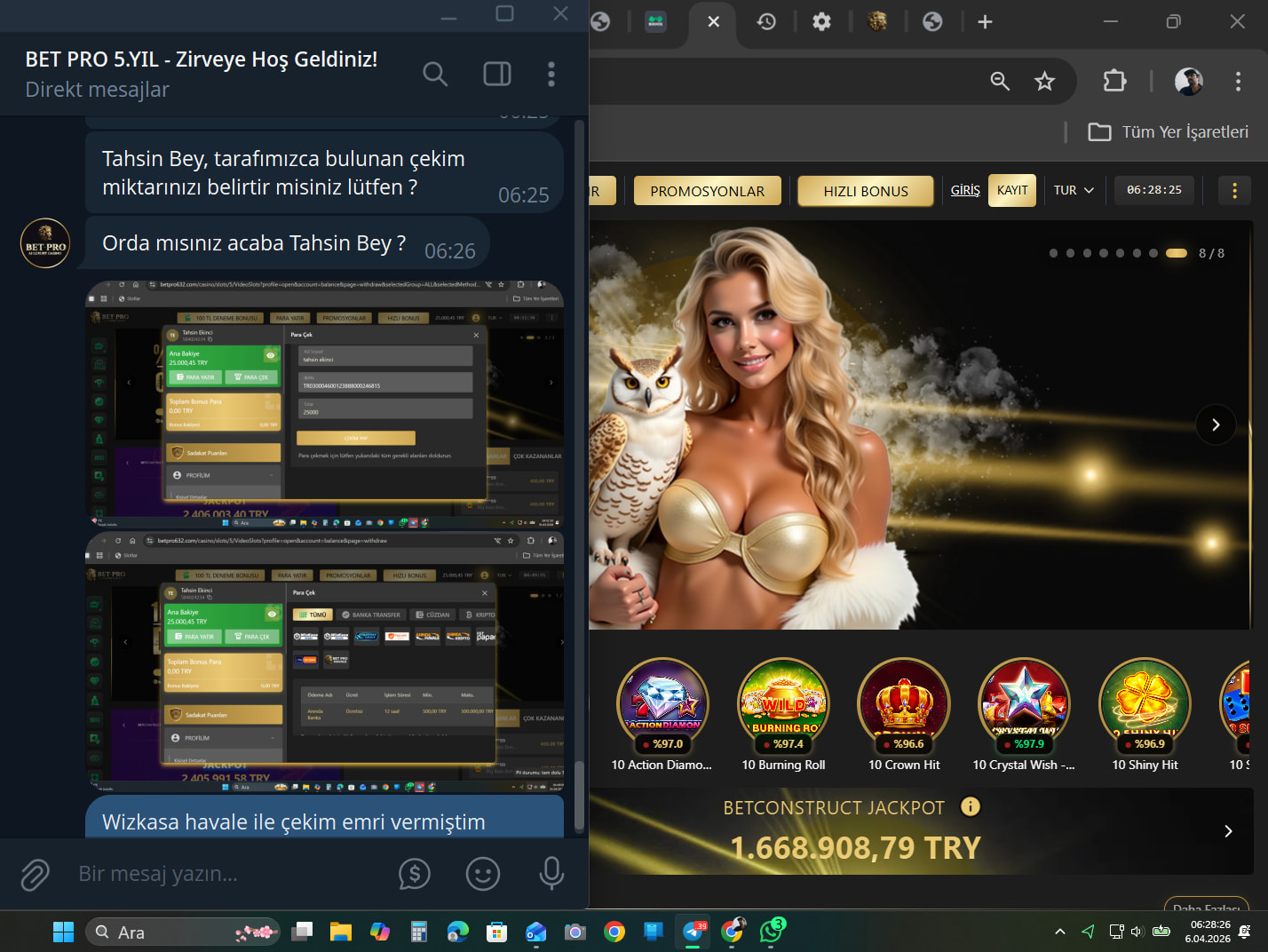 benimle iletişime geçti ve sitede bakım var dedi benim sitede kalan ben param var hesabımda çekim emri vermiştim param hesabıma gelmedi dedim ben ilgileniyorum dedi BETPRO634.com