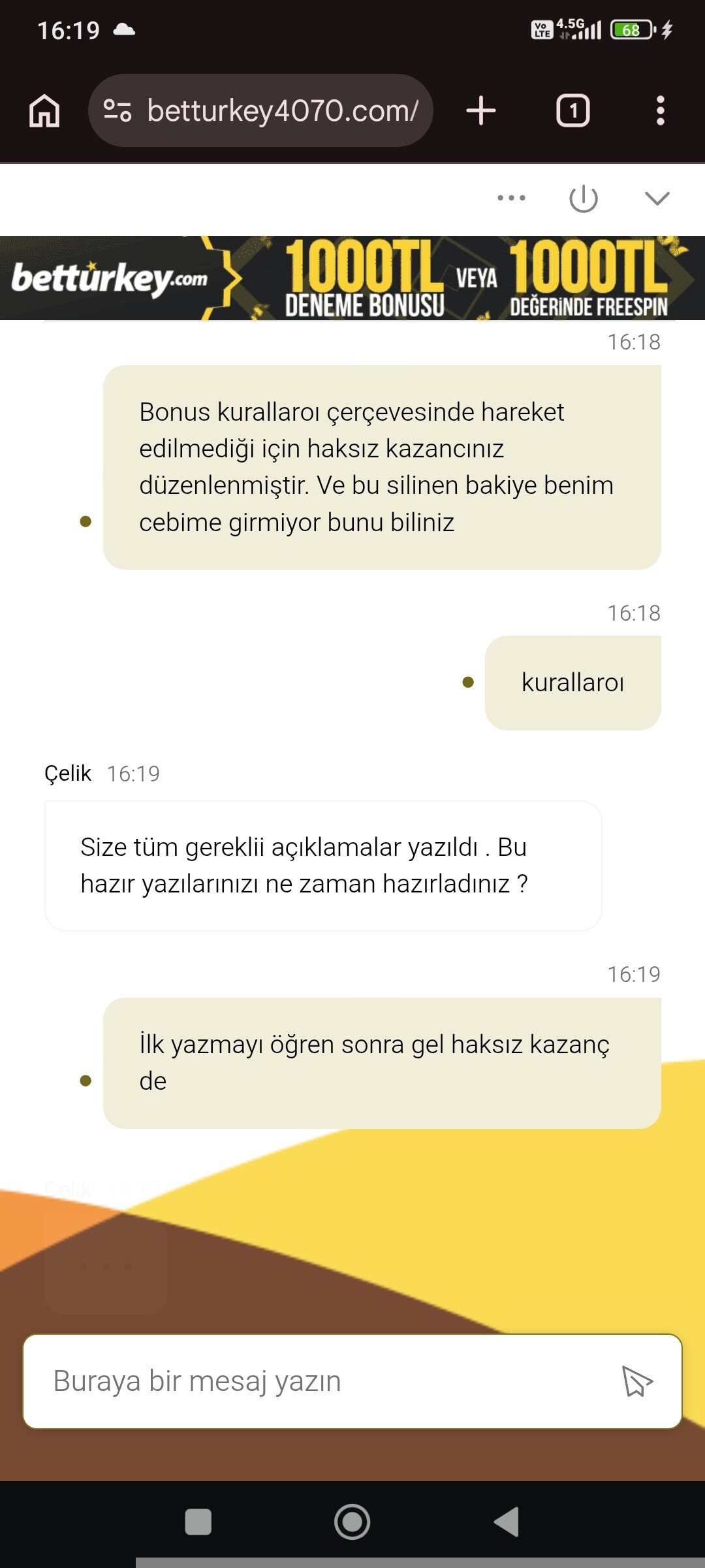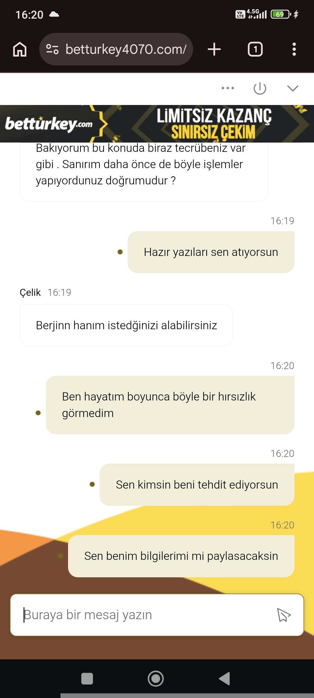 Betturkey’in haksız yere sildiği 61.592 TL tutarındaki bakiyemi, gerçekleştirdiğim çekim talebimi derhal ve eksiksiz şekilde ödemesini talep ediyorum. Herhangi bir Bonus kullanmadığım halde böyle bir gerekçeyle paramın silinmesini ve erişimimin engellenmesini kabul etmiyorum. Bu süreçte yaşadıklarım nedeniyle diğer kullanıcıların da bu durumu bilgilendirilmesini ve mağduriyetlerin önüne geçilmesini istiyorum sonra tekrar dan bağlandım tehdit edildiğim