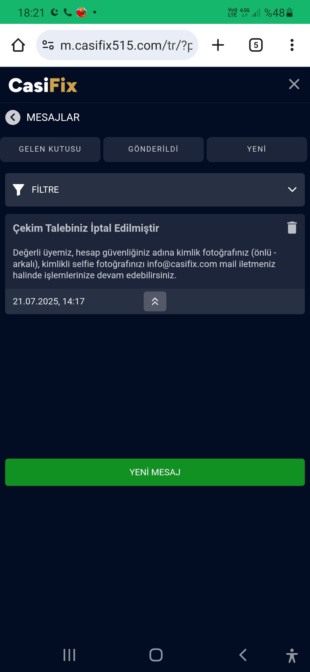 Casifix isimli şirkette oyun oynadım.20 temmuz 2025 pazar günü.20000 tl yatırım yaptım.25300 çekim talebi verdim.21 temmuz gece 02.00 de. Önce paranız Az sonra yatırılacaktır dediler 3-4 saat sonra güncellemedeyiz dediler 5-6 saat sonra gün içerisinde kimlik belgesi resimli foto istediler ondan sonra bankada yoğunluk var dediler ondan sonra da beni engellediler.