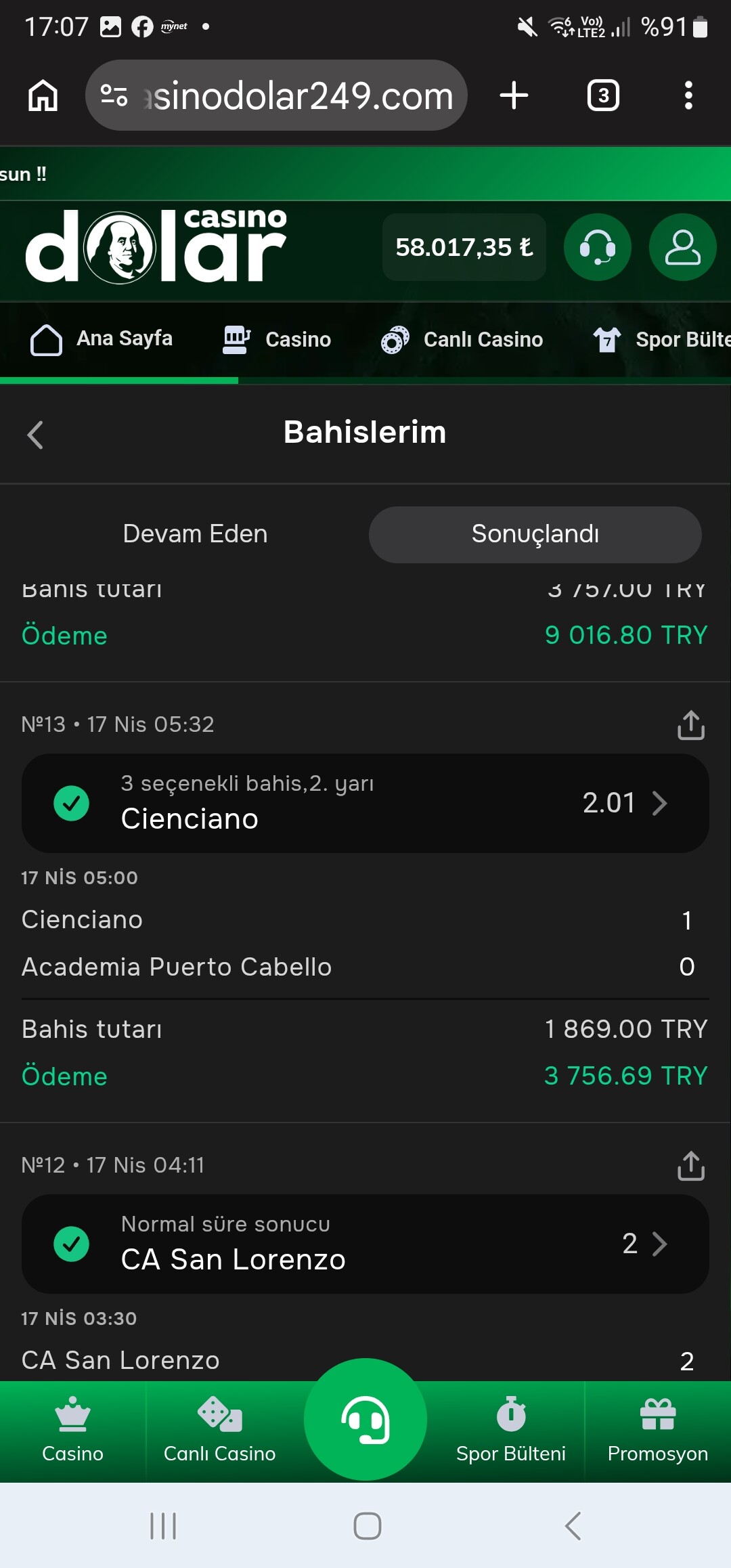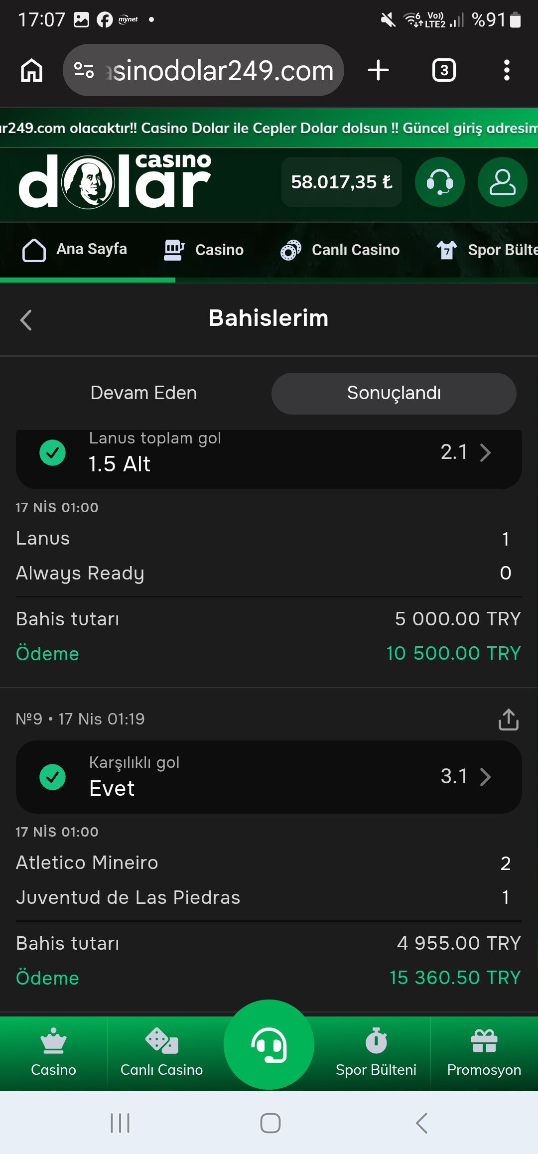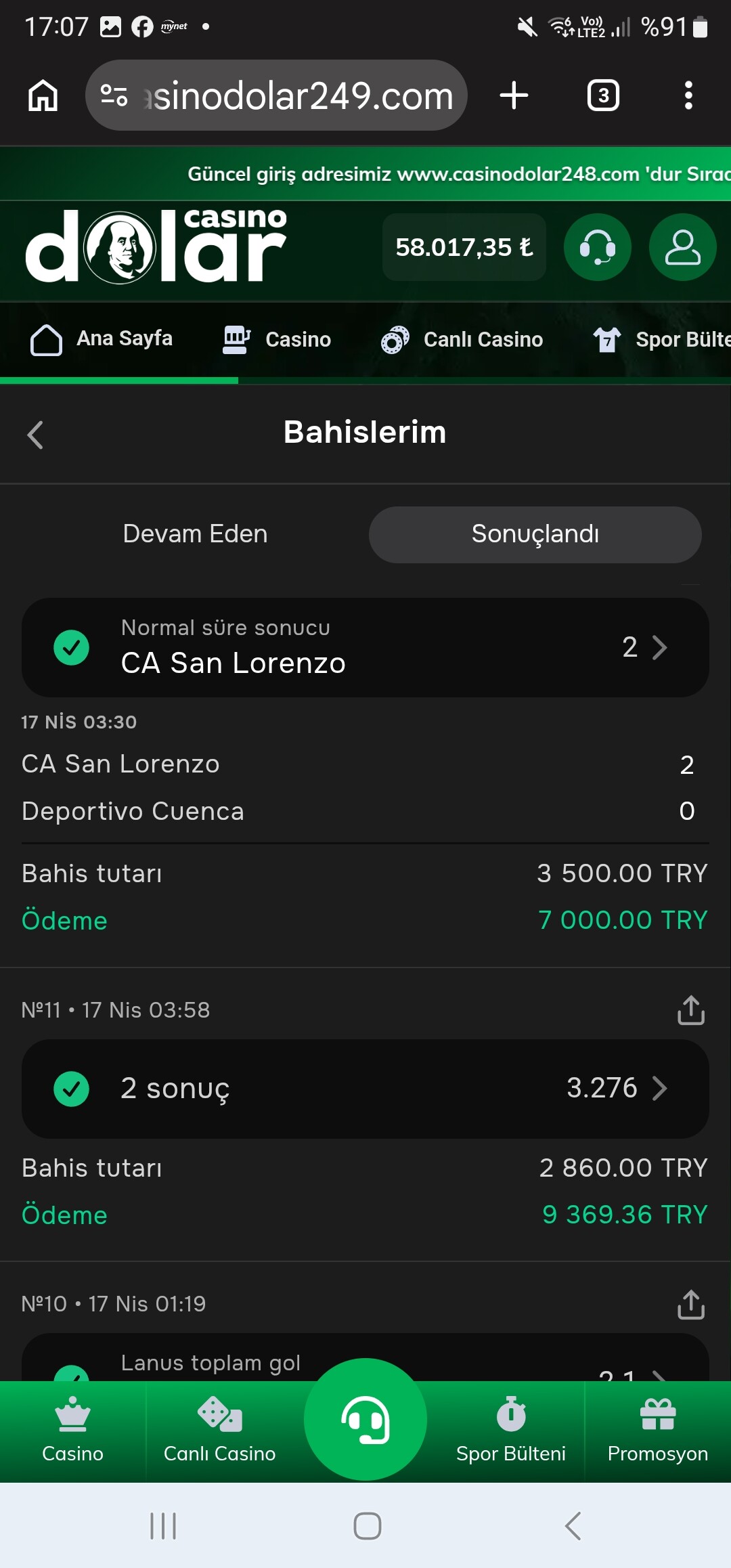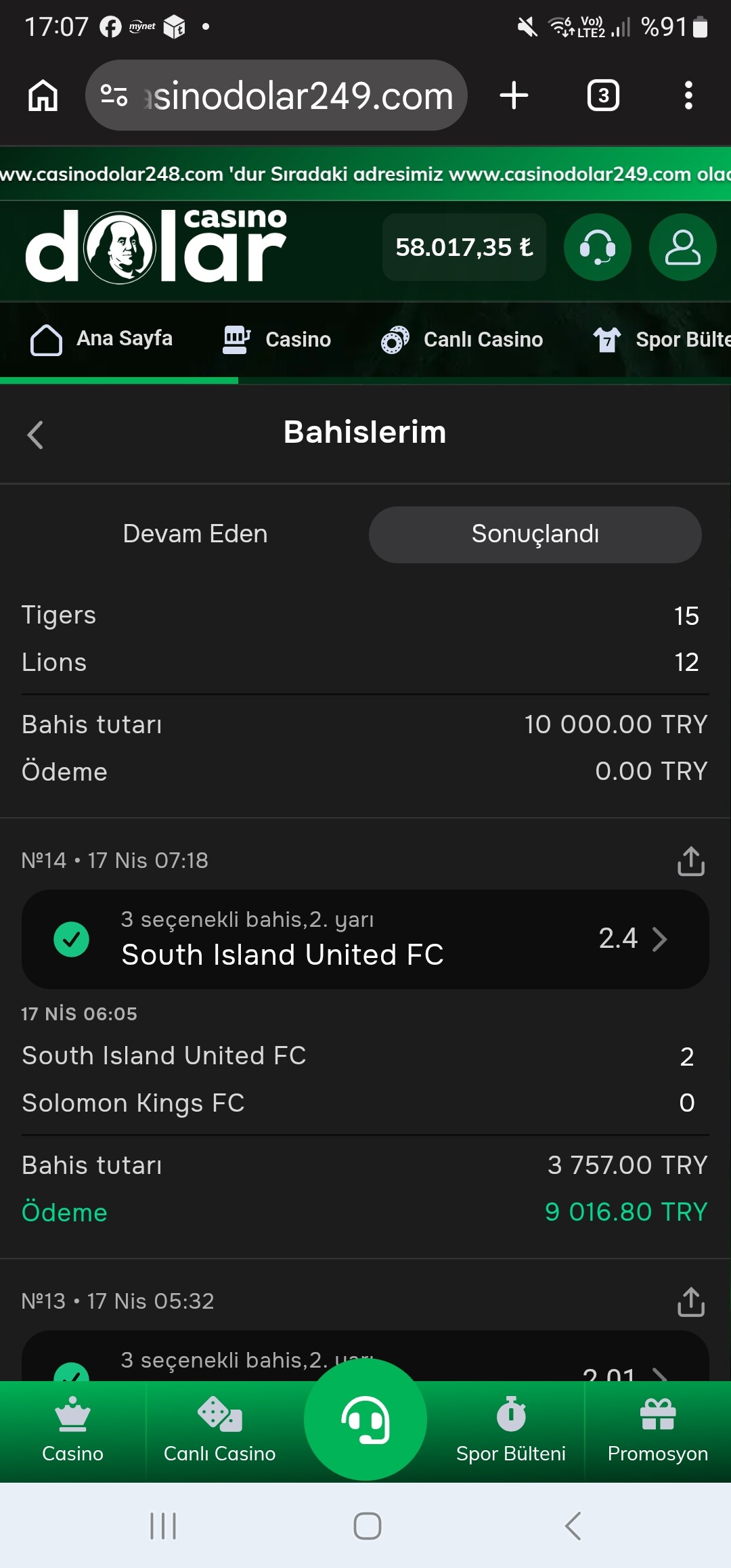 Bundan 5 gün evvel casinodolar sitesi başka sitelerde yatırımınız çok artık bize yatırın şöyle çekim böyle……bilinen masallara inandım 10k yatırdım 2k bonus verdiler 15 dakika içinde kaybettim.hemen bu yatırım yatınca 10k daha yatırdım 2k daha verdiler..bu sefer toplamda 40k oyun oynadım kombineliler var tekliler var.30k çekim verdim 1 gün bekletip aradılar beni 1 kat demelerine rağmen davet ederken size özel diye!!!dedilerki.anaparanın 5 kat daha çevrimi var.hiç itiraz etmedim ve 70k daha oyun oynadım bahis aldım 8 farklı kuponda.bakiyem 58.017,00 tl yani 58k oldu..bu seferde 1 gün bekletip evrak diyip kimlim istediler 3 gün de anca kontrolü yapılır dendi..bunada eyvallah .toplamda 100k dan fazla kupon oynanmış 4-5 tanesi kombineli maç sonucu 5-6 tanesi tekli…ve sonuç..dolandırıldım