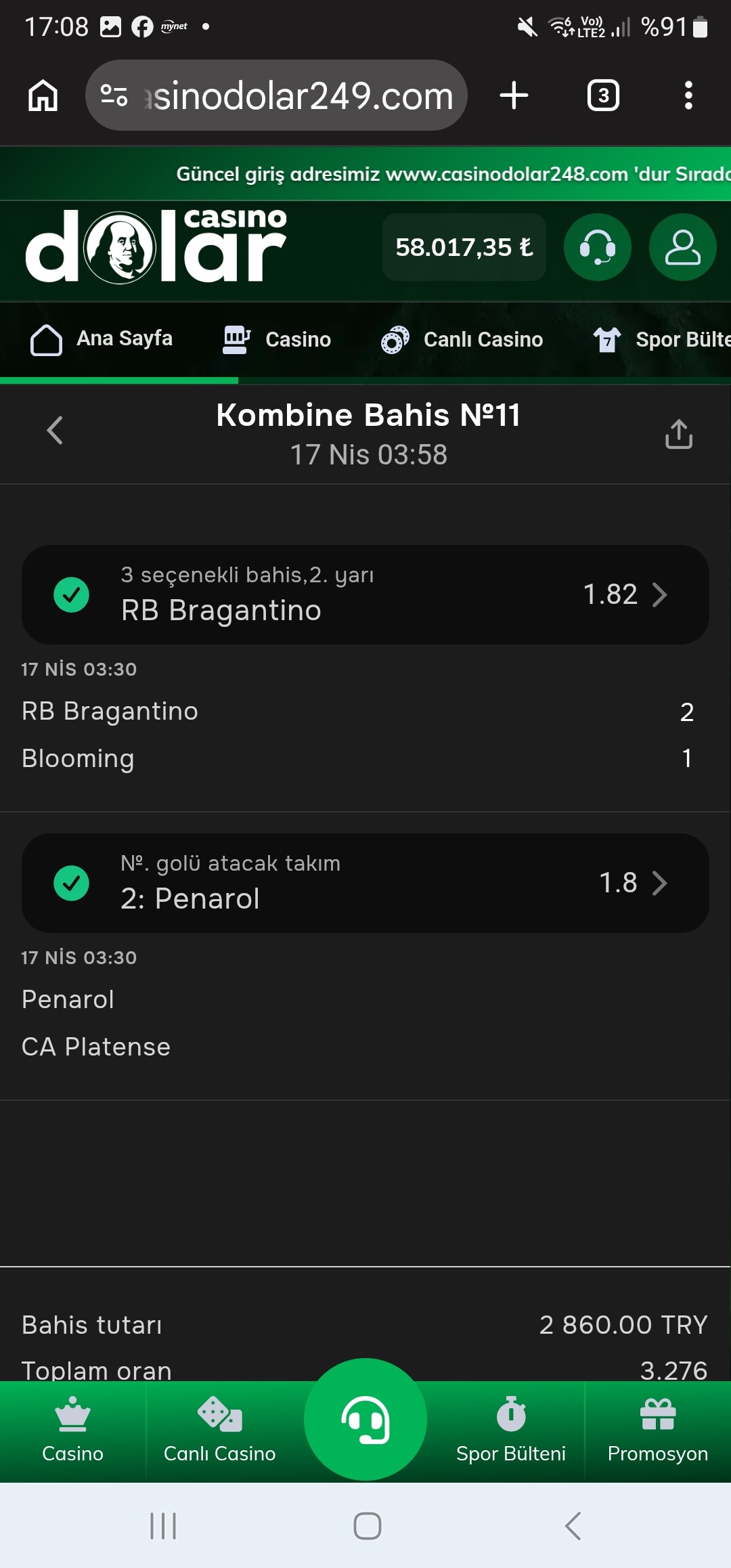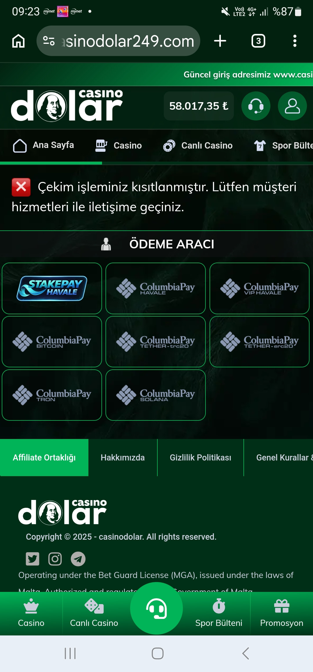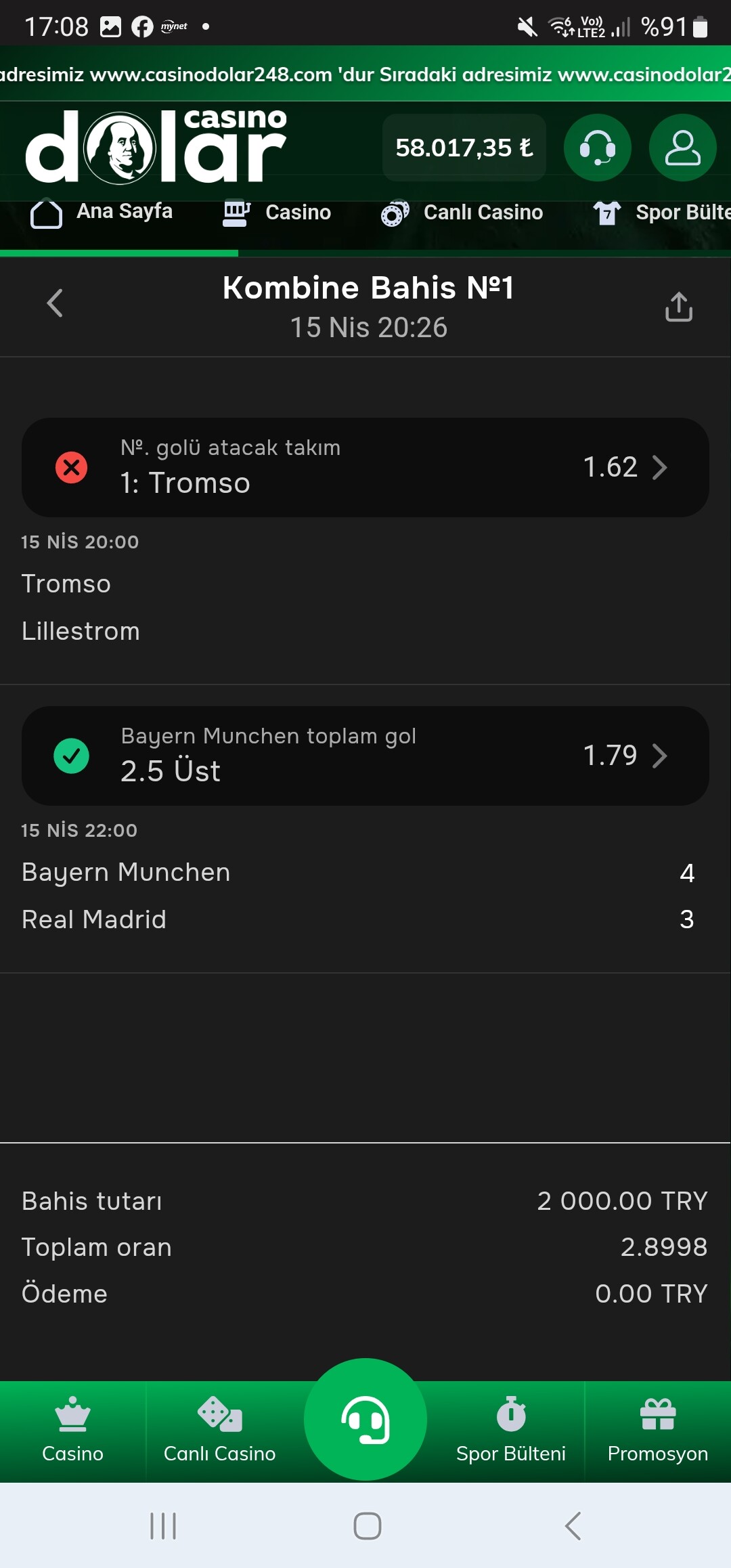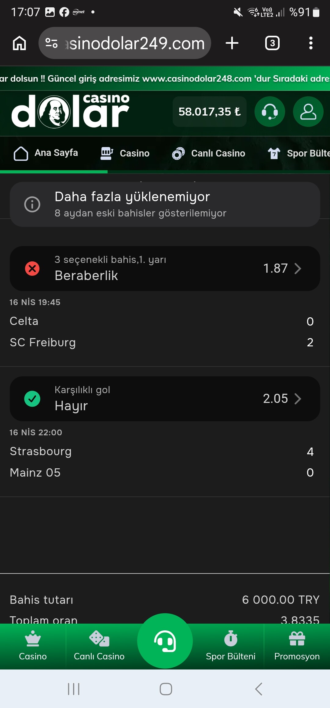 Bundan 5 gün evvel casinodolar sitesi başka sitelerde yatırımınız çok artık bize yatırın şöyle çekim böyle……bilinen masallara inandım 10k yatırdım 2k bonus verdiler 15 dakika içinde kaybettim.hemen bu yatırım yatınca 10k daha yatırdım 2k daha verdiler..bu sefer toplamda 40k oyun oynadım kombineliler var tekliler var.30k çekim verdim 1 gün bekletip aradılar beni 1 kat demelerine rağmen davet ederken size özel diye!!!dedilerki.anaparanın 5 kat daha çevrimi var.hiç itiraz etmedim ve 70k daha oyun oynadım bahis aldım 8 farklı kuponda.bakiyem 58.017,00 tl yani 58k oldu..bu seferde 1 gün bekletip evrak diyip kimlim istediler 3 gün de anca kontrolü yapılır dendi..bunada eyvallah .toplamda 100k dan fazla kupon oynanmış 4-5 tanesi kombineli maç sonucu 5-6 tanesi tekli…ve sonuç..dolandırıldım