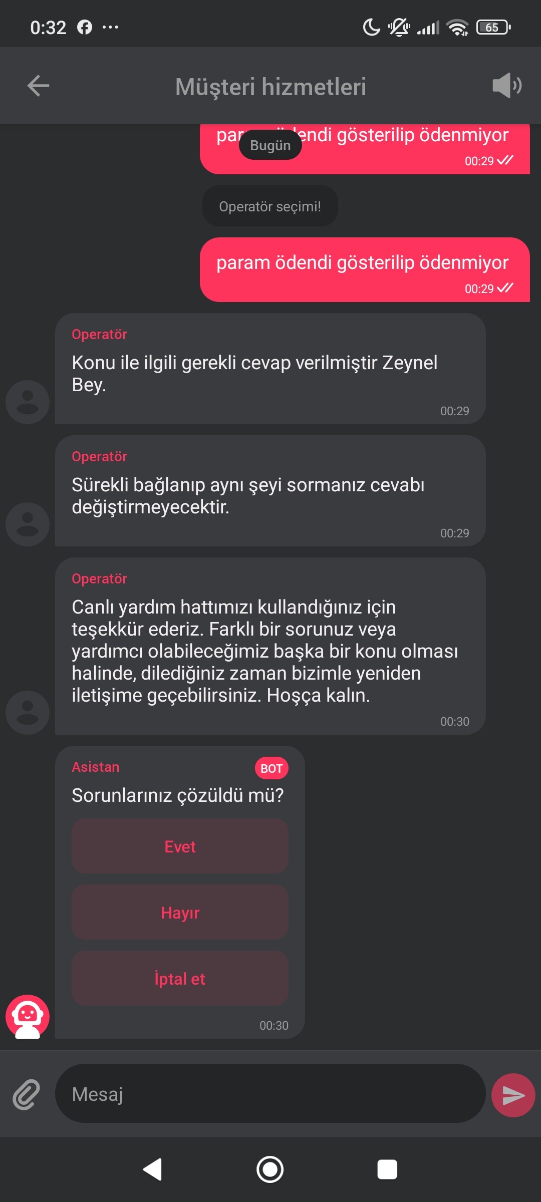 DBBET paramı ödendi gösterip ödemiyor daha önce de para çektim bunlardan ve bunun gibi sitelerden para ödendi diyor ama çekim gelmedi onlar da öyle diyor o zaman ödendi diye neden gösteriyorsunuz ben muhattap bulamıyorum.sorduğumda gördüğünüz gibi suratıma sohbeti kapatıyorlar