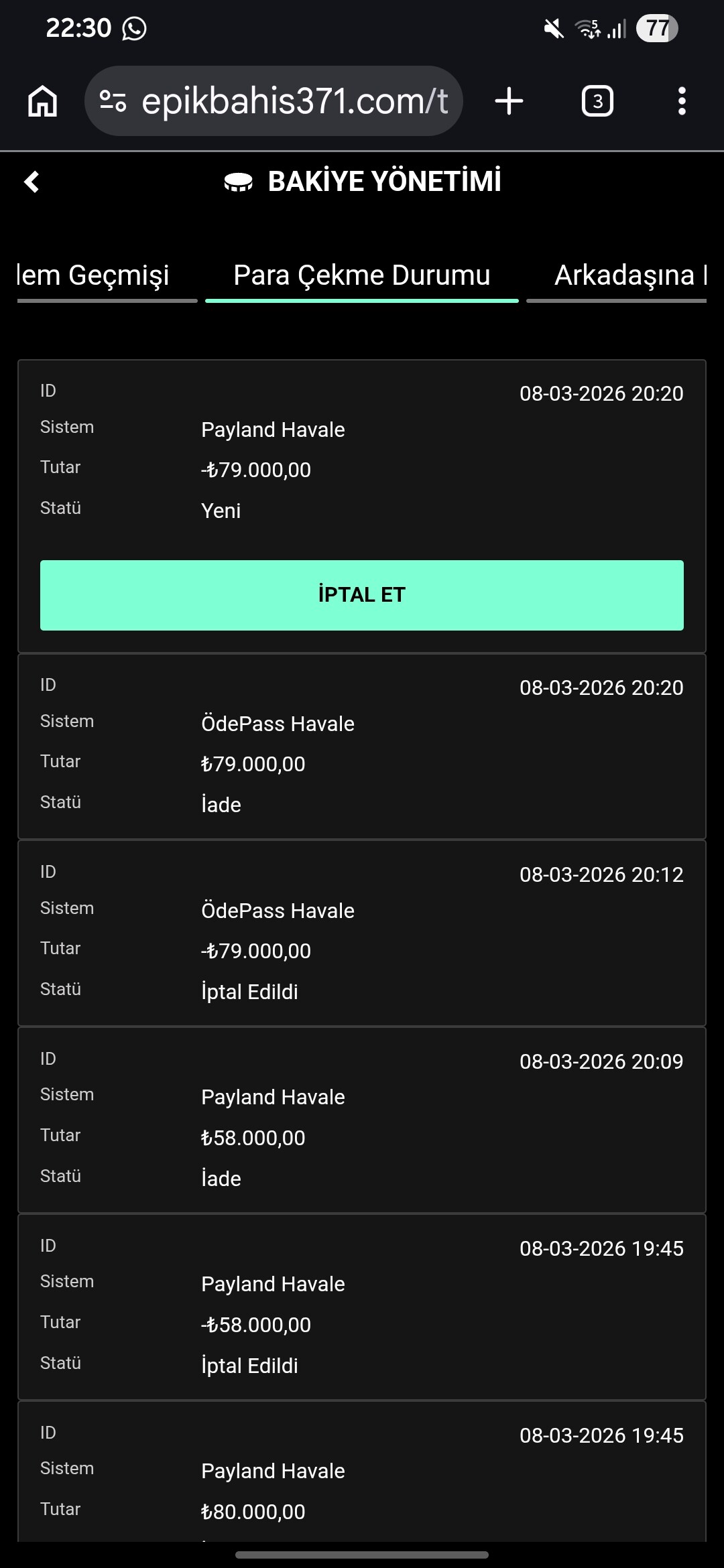 79 bin tl tutarındaki kazanç için saat 17.00’den itibaren defalarca çekim talebi verdim, işlemler sürekli reddedildi. Son olarak saat 20.20’de verdiğim çekim talebi ise bu kez işleme bile alınmadı, sistemde hâlâ beklemede görünüyor. Canlı desteğe her yazdığımda sadece “bekleyin” denilip saatlerce oyalandım, yaklaşık 5 saattir aynı cevap veriliyor ve somut bir işlem yapılmadi ardından 5 saat sonrasında risk birimi ayağı altında hesabıma askıya alındı.