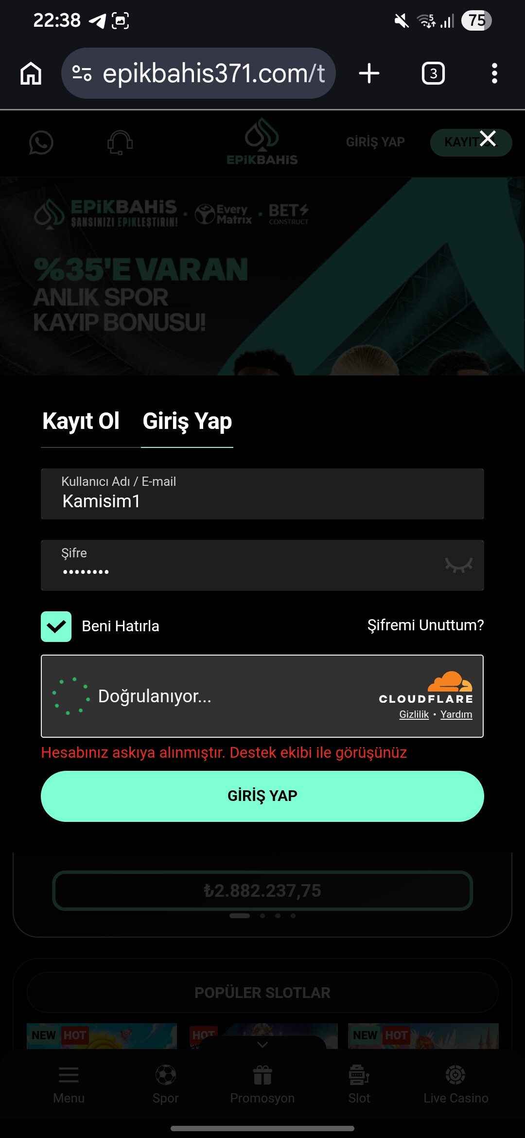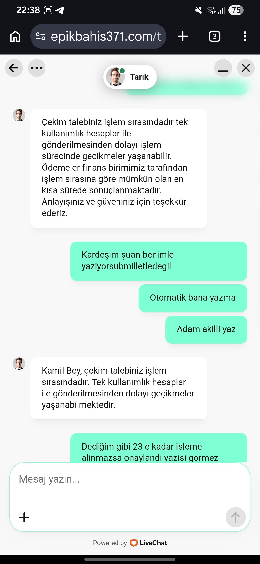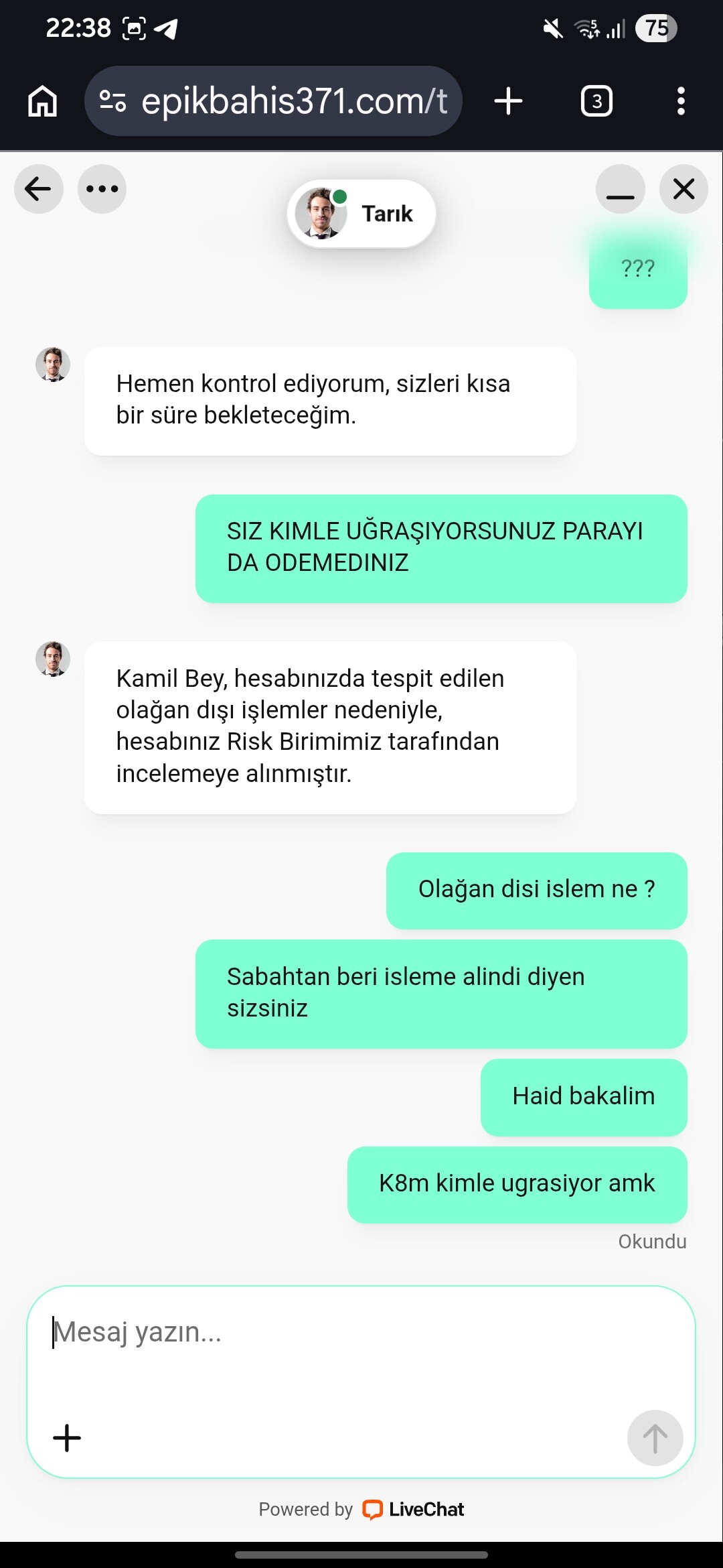Epikbahis sitesinde “kamisim1" kullanıcı adıyla 2 seneyi aşkın süredir üyeliğim bulunuyor. Bugün sabahtan beri yaşadığım ödeme sorunu nedeniyle mağdur durumdayım. Önce 75 bin tl’lik kazancım için sorun yaşadım, bununla ilgili şikayet açtıktan sonra ödemeyi yaptılar ve ilgilendiler. O sırada bir daha sorun olmayacağını özellikle belirtmelerine rağmen, bu kez de 79 bin tl’lik kazancımı ödemiyorlar.
