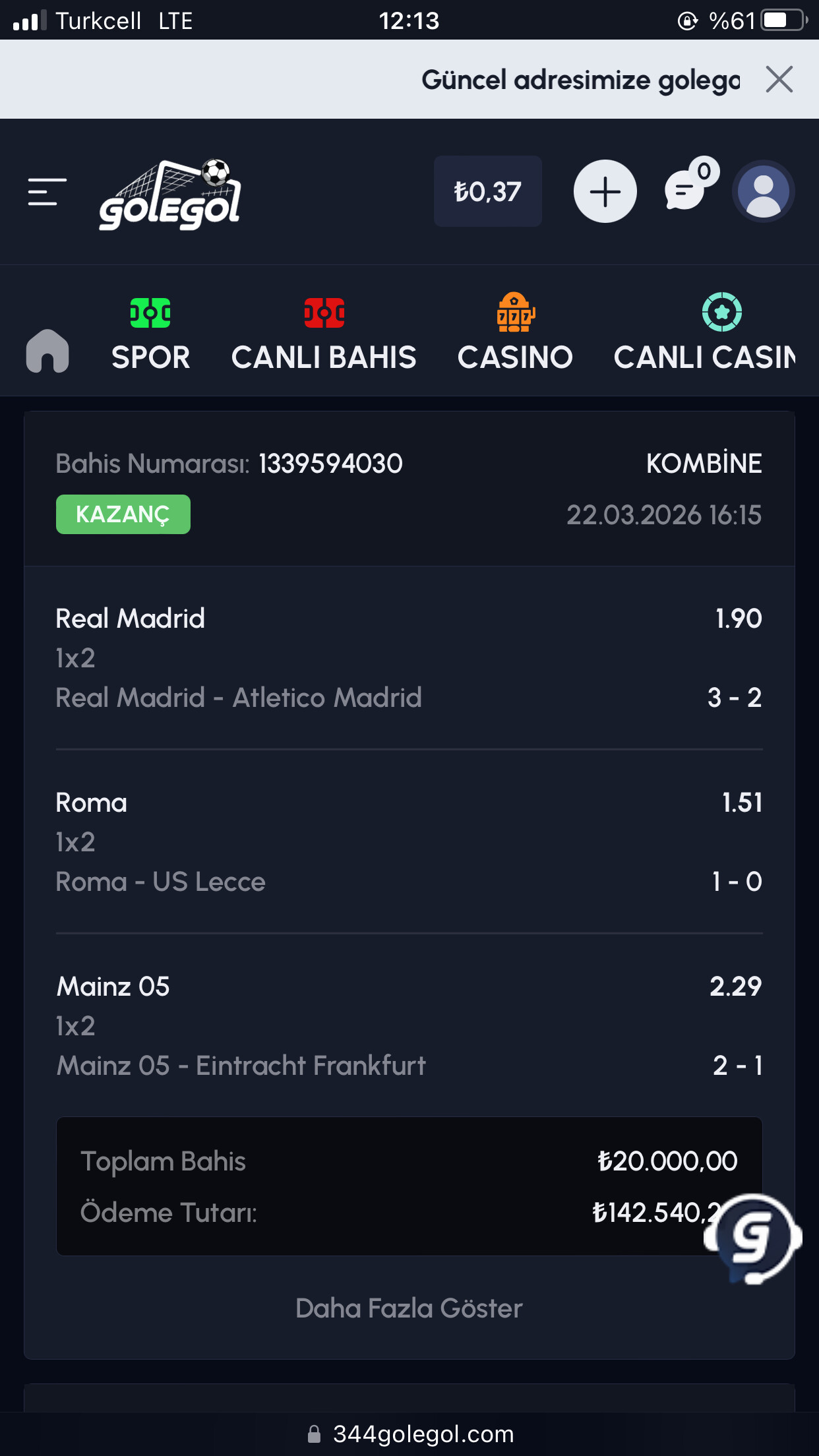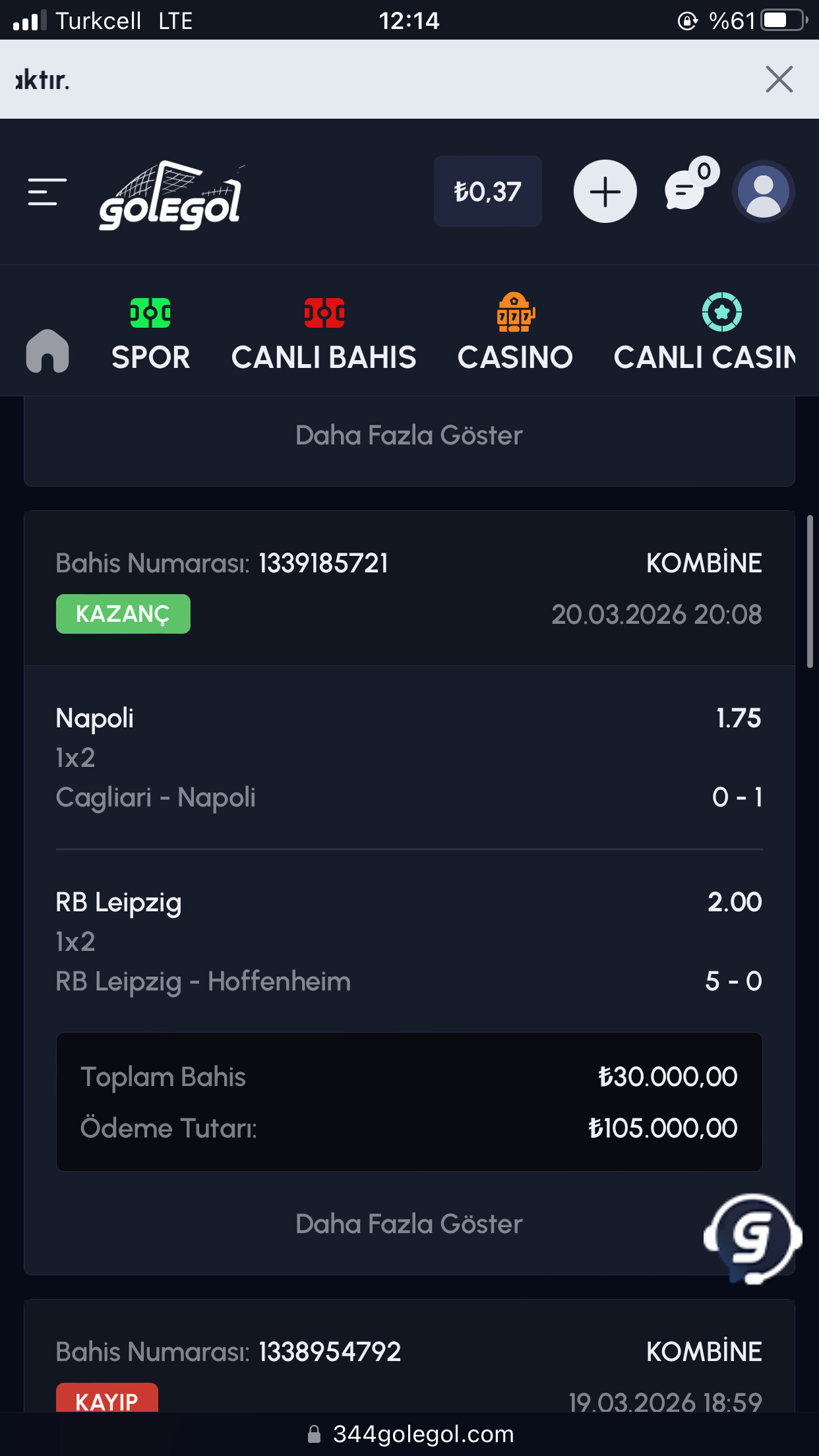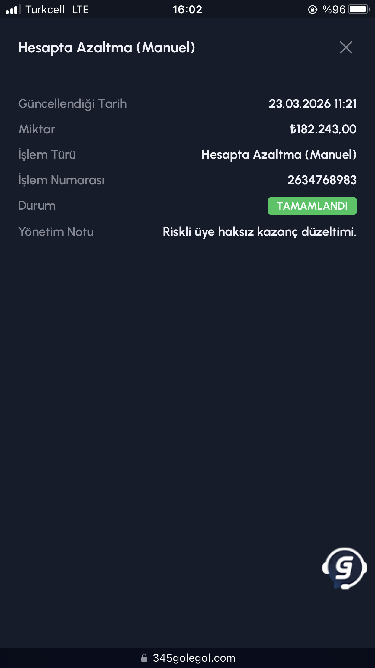 20.03.2026 tarihinde Golegol sitesi üzerinde kendi adıma açtığım hesaba 30.000 TL para yatırdım. Herhangi bir Bonus ya da promosyon almadan, tamamen kendi yatırdığım bakiye ile 23.03.2026 tarihine kadar majör liglerden yalnızca maç sonucu üzerine 2’li ve 3’lü kombine kuponlar oynadım ve bu kuponlar sonucunda toplamda 182.000 TL kazanç elde ettim.