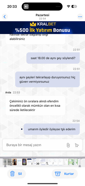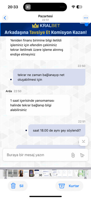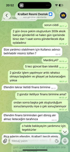 29/03/2026 tarihinde oluşturmuş olduğum 400k çekimimde sadece 100k attılar 300k halen sonuçlanmadı ve sistemde onaylı gözükmekte.. Hesap hareketlerini ve 2 kez detaylı video istemelerine rağmen attım gönderdim.. her canlı desteğe bağlandığım sırada güncel iban istiyorlar.. ( 5 kez ) 1 saat içinde gönderilecek mesai saatinde gönderilecek diye diye 4-5gün oldu cevap yok oyalanıldığımı hissediyorum. Aranma talebi oluşturdum aranılmadım. Telegram destek görüldü atıyor… Aranma talebi oluşturuyorum ama yalan dolan 1 saat yok çekim öne alındı yok finans birimi inceleniyor diye diye oyalıyorlar… Tüm kanıt belgeler mevcut…