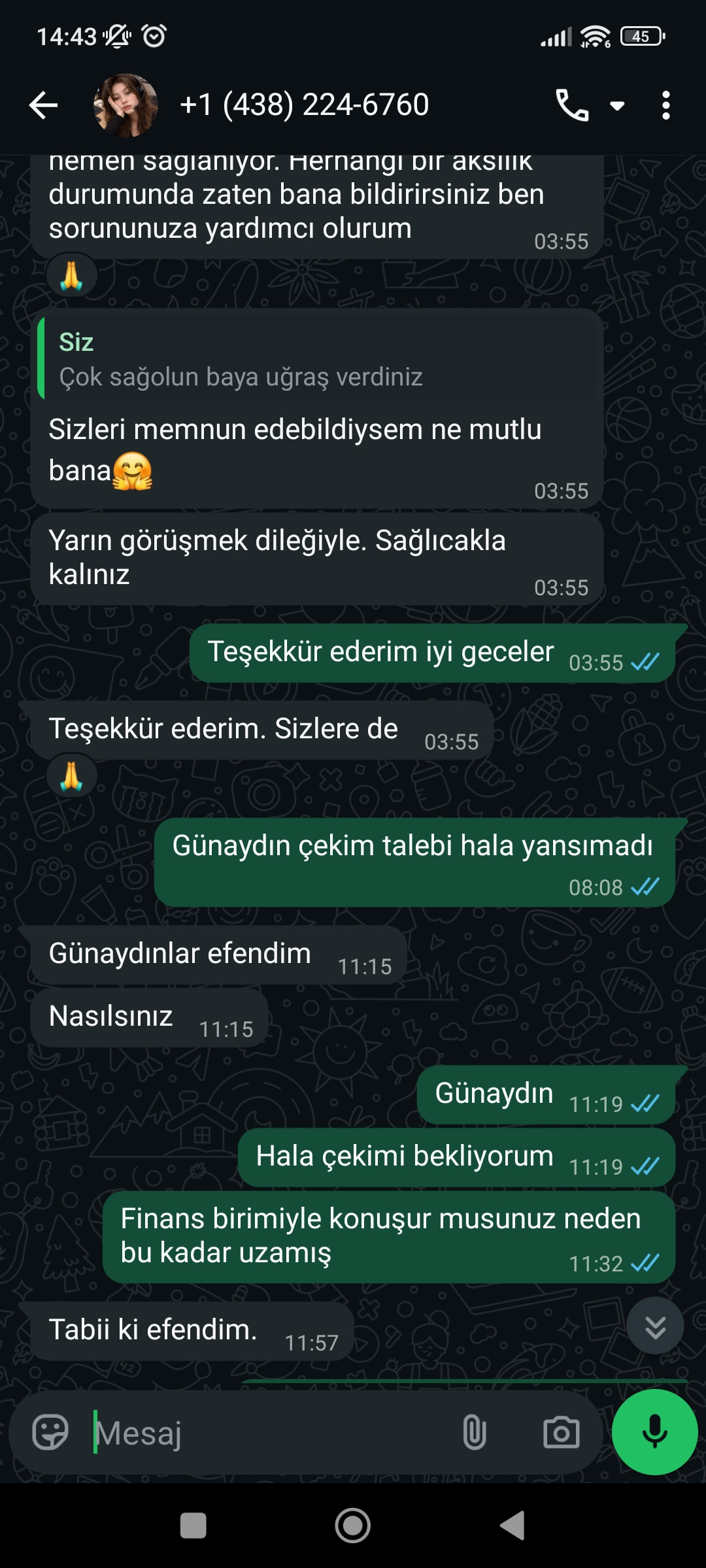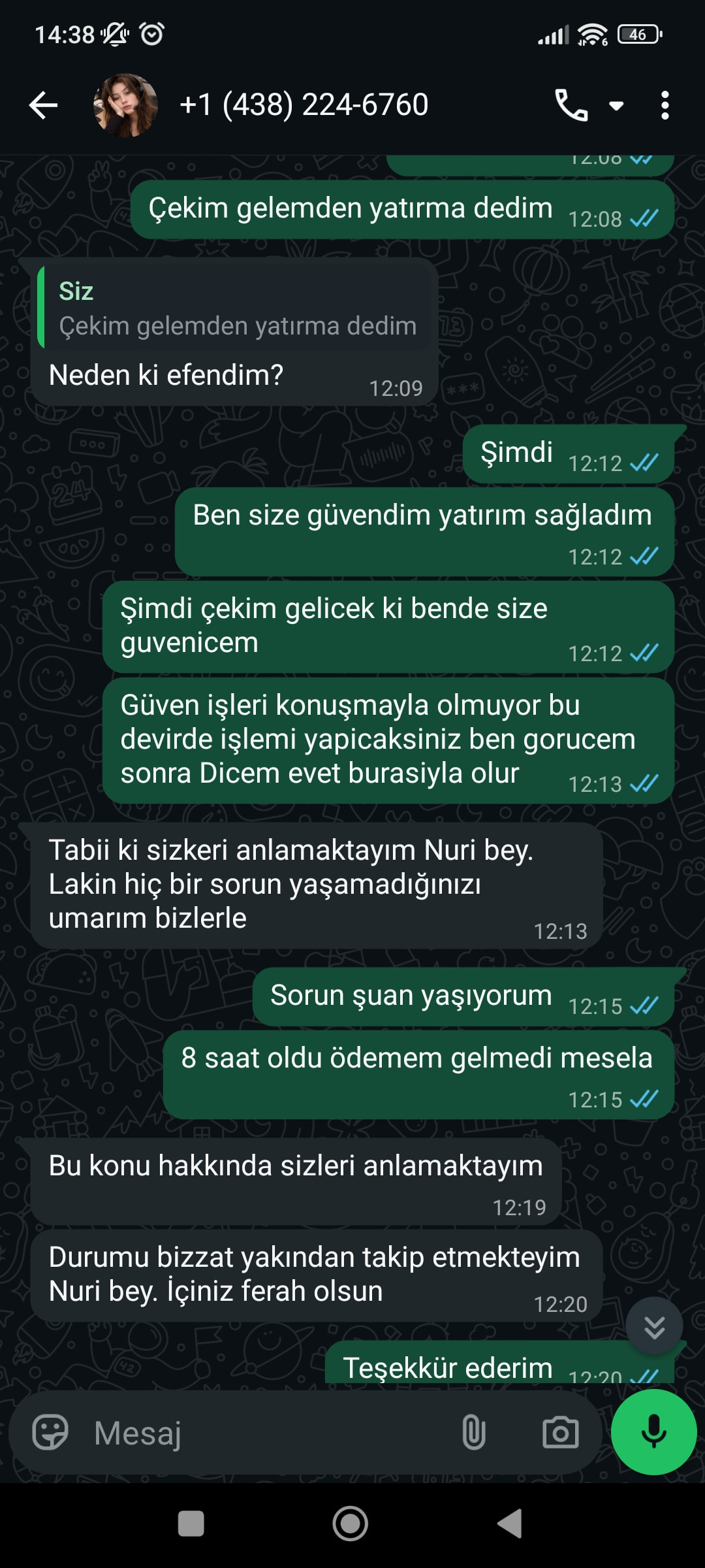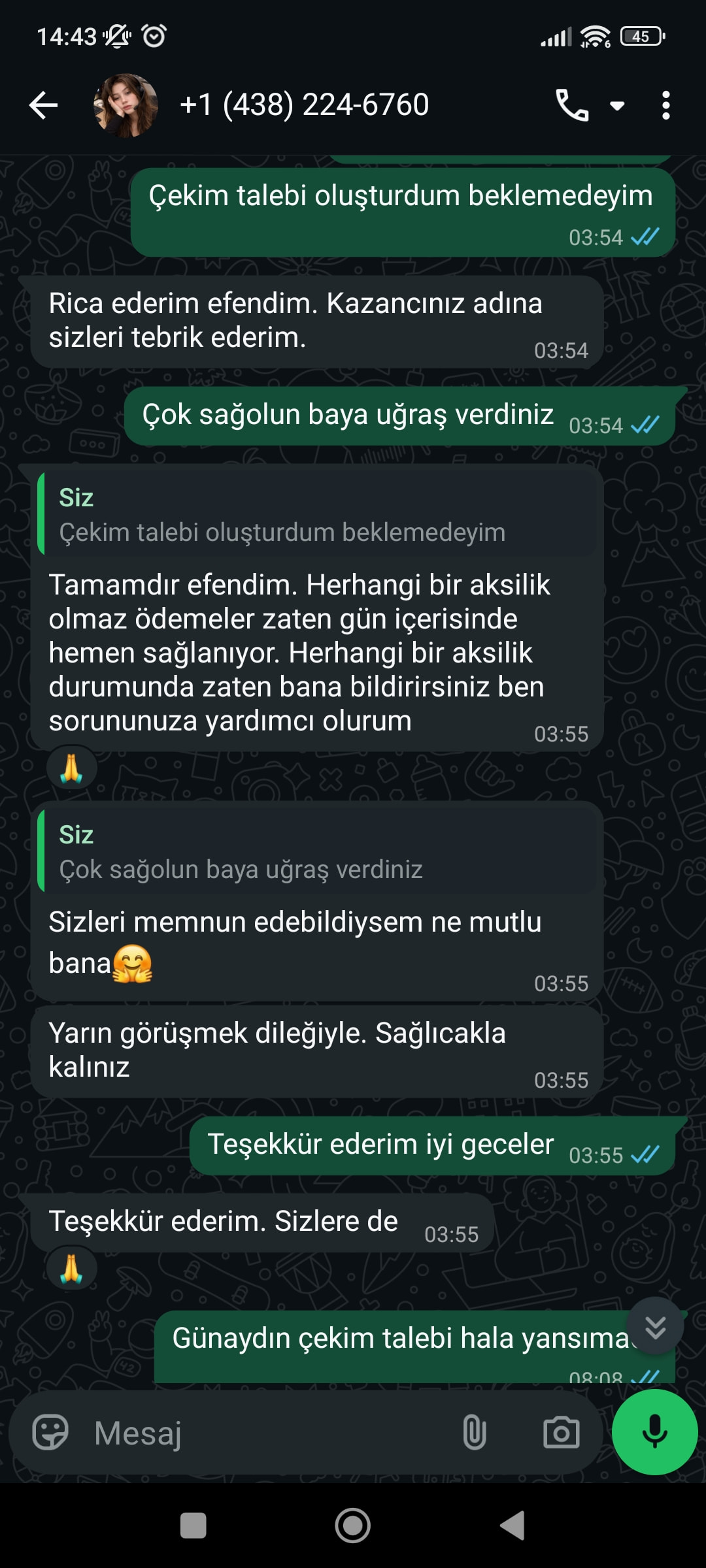 Öncelikle bu sitenin müşteri hizmetleri nilsu adında kişi tarafından arandım bonus için mantıklı geldi yatırım yaptım kaybettim birdaha yatırım yaptım gene kayıp en son yatırımda kazanc oldu çekim verdim bu arada müşteri temsilcisi ile yazisiyoruz ben herşeye yardım edicem v.s çekim talebi verdim finans birimiyle konuşuyorum ilettim derken birden saat 13.00 da mesajlarım iletilmiyor sitenin müşteri hizmetlerine bağlanti hiç bir şekilde olmuyor biz mağdur olduk siz olmayın